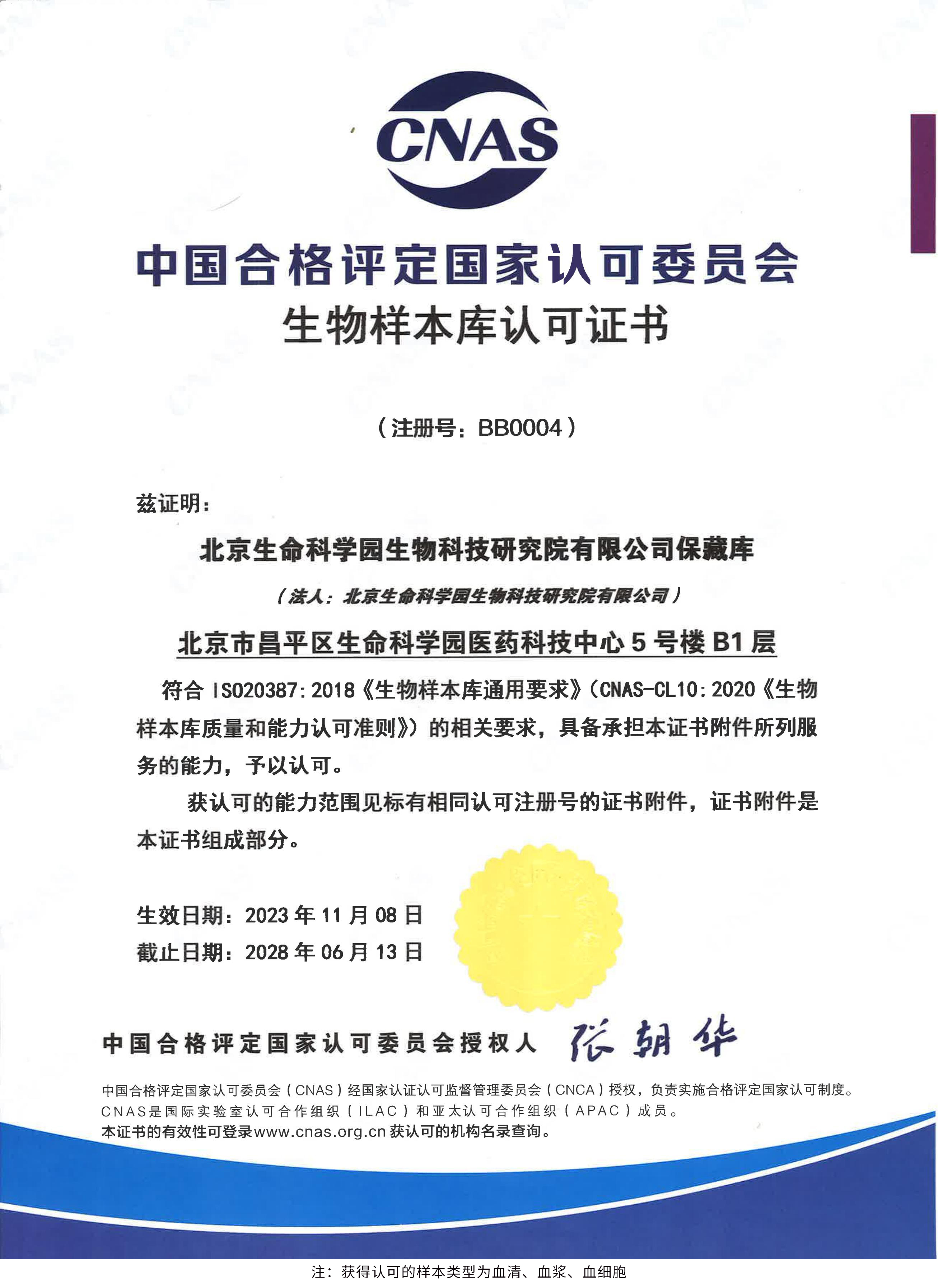 北京生命科學(xué)園生物科技研究院(以下簡稱“北京生物樣本資源庫”)(Biobank of Life Science Park,簡寫“BoLSP”)是一家由北京市科委和中關(guān)村生命科學(xué)園共同支持設(shè)立的第三方生物樣本庫公共服務(wù)平臺,秉承北京重大疾病臨床數(shù)據(jù)和樣本資源庫(以下簡稱“北京庫”)(Beijing Biobank of Clinical Resources,BBCR)十余年的發(fā)展成果,聚合眾多臨床樣本專家的專業(yè)共識,致力于在生命科學(xué)、生物醫(yī)藥研究領(lǐng)域發(fā)揮銜接樣本資源持有者與研究者的橋梁作用,解決生物樣本資源開發(fā)上下游信息不對稱、資源共享困難等問題。研究院在北京中關(guān)村生命科學(xué)園昌平園區(qū)建立了2000㎡生物樣本庫,最大存儲規(guī)模達1000萬份。研究院遵循CNAS-CL10:2020《生物樣本庫質(zhì)量和能力認(rèn)可準(zhǔn)則》,同時結(jié)合北京庫過去十年的工作經(jīng)驗與教訓(xùn),建立了一套完善的生物樣本保藏質(zhì)量管理體系,從人、機、料、法、環(huán)、控多個角度,實現(xiàn)生物樣本保藏過程的全面質(zhì)量控制,先后獲得國家科技部頒發(fā)的人類遺傳資源保藏行政許可證書和中國合格評定國家認(rèn)可委員會(China National Accreditation Service for Conformity Assessment,CNAS)頒發(fā)的“CNAS認(rèn)可證書”。